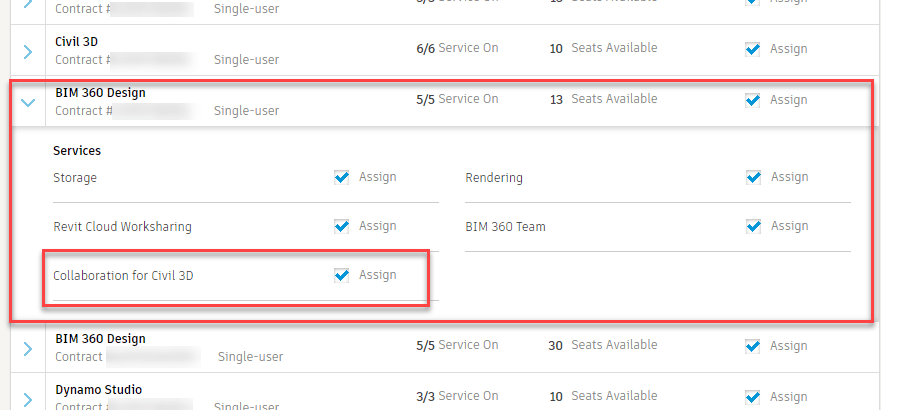 Users who have access to BIM360 Design and are assigned to a Project who wish to use Collaboration for Civil 3D will need to have the service entitlement assigned to them by the Contract Manager/Administrator or Software Coordinator/Secondary Admin. It is unassigned by default.