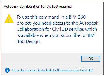 You will receive the following, or similar, if the service has not been assigned while attempting to use the collaboration service for Civil 3D: