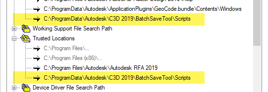 If you only have Civil 3D 2019 installed, there should be no issue and the script should run normally. However, if you have AutoCAD 2019 also installed along with Civil 3D 2019, the script may fail. The reason? The installation adds the path C:\ProgramData\Autodesk\C3D 2019\BatchSaveTool\Scripts to both the “Support File Search Path” and “Trusted Locations” sections of your Civil 3D 2019 Options tab, but does not do it for plain AutoCAD 2019.