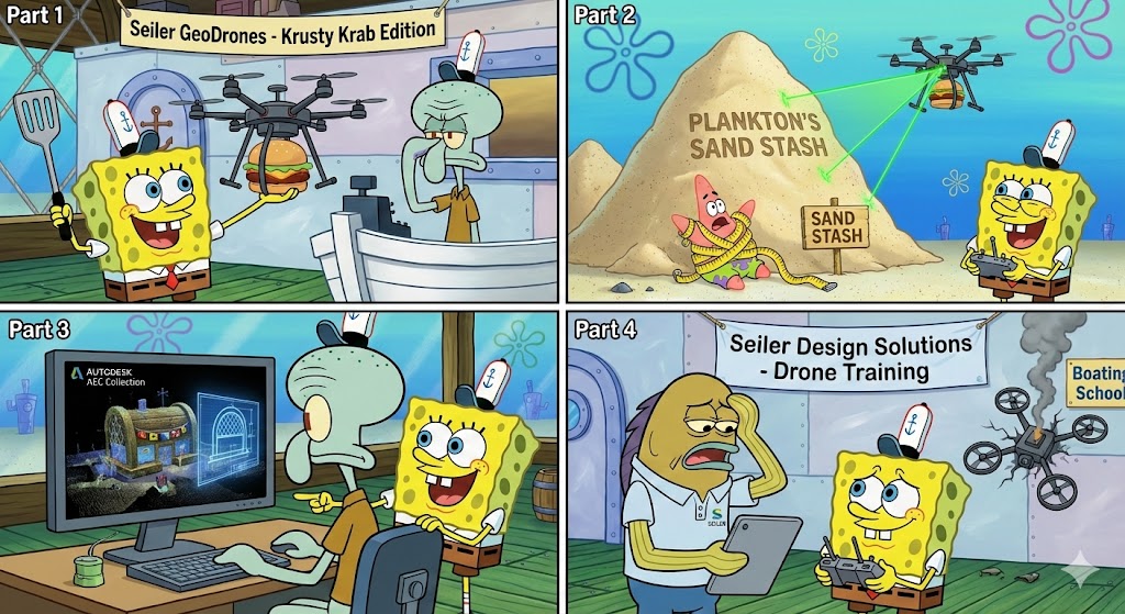 SPONGEBOB: Because Patrick got tangled in the measuring tape last time, remember? Seiler GeoDrones makes AECO projects way faster and safer!