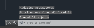 Just type AUDIT in the command line and answer YES to the prompt. Your AutoCAD product will then audit and check the drawing database for errors and clean out any bad items if found. Save your drawing when complete.