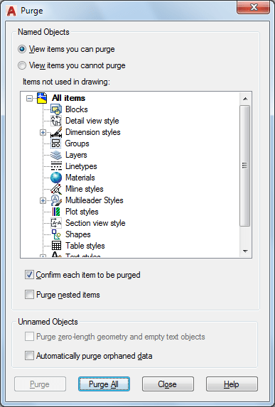 Type PURGE in the command line, or choose PURGE from the Drawing Utilities section of the main AutoCAD menu and the Purge dialog box is displayed. From this dialog box you have the option to View items you can and cannot purge as well as a tree list of items. If you choose “View items you can purge”, the items in the tree list are purgable. You can select individual items to purge by expanding the tree, or you can choose an entire section to purge. Select the item and choose the Purge button at the bottom, or if you so wish, choose the Purge All button and clean your drawing of all unused items in one step.