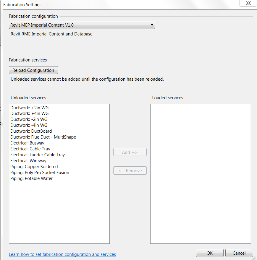 Use the Fabrication Settings dialog (located under Manage, MEP Settings)to specify a fabrication configuration for the model. The configuration must reside on your network or on a local drive. Each Revit MEP model may use only one configuration at a time.