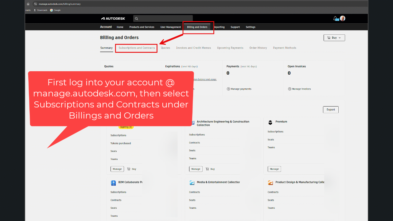 manage.autodesk.comand sign in with your credentials. - Navigate to Subscriptions and Contracts: Once logged in, find the section for “Billing and Orders,” and then select “Subscriptions and Contracts.”