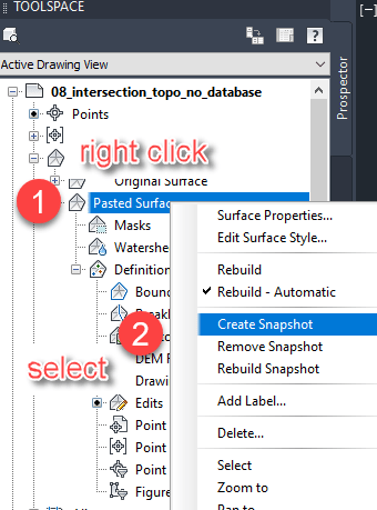 A snapshot is a surface operation that captures the current state of surface. …The current surface points and triangles resultant from previous surface operations are contained in a surface snapshot operation. When a surface is built, previous surface operations are ignored and the surface build begins at the snapshot operation.