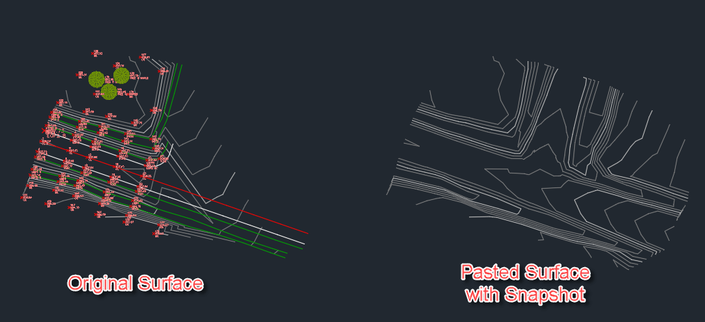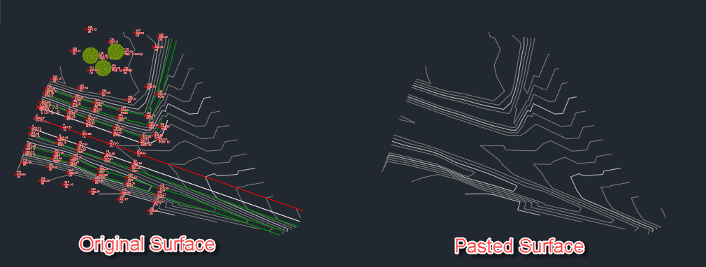In the image below, you see 2 surfaces: The surface on the left is an original surface created from COGO points and feature lines, and surface on the right is a blank surface with the original surface on the left pasted into it. Functionally, they are both the same, though I have shifted the pasted surface to the right for clarity.