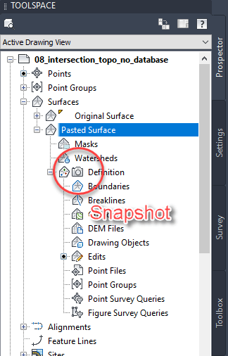 At one time or another you may have opened a Civil 3D drawing sent to you and noticed, while viewing details of a surface in the Prospector tab of the Toolspace, what looks like a little camera icon next to the Definition section.  What does that little icon mean?